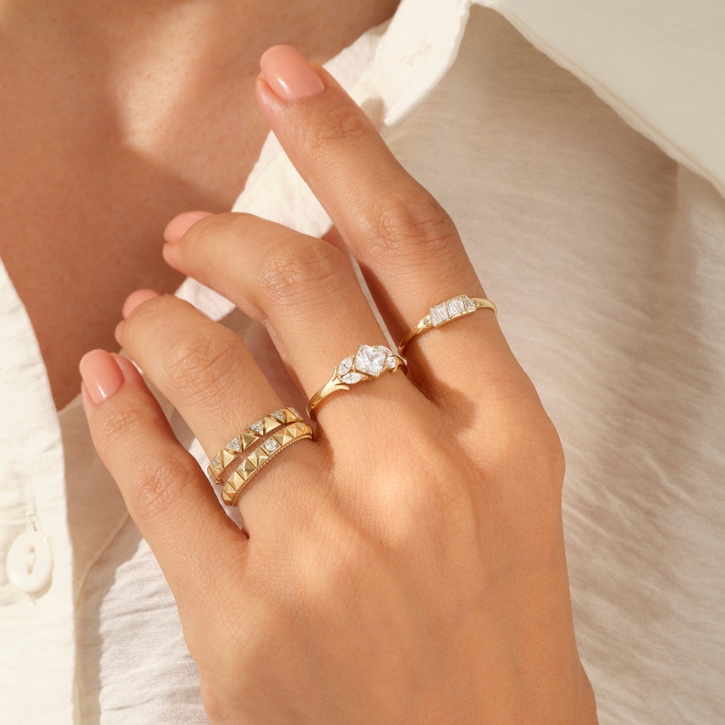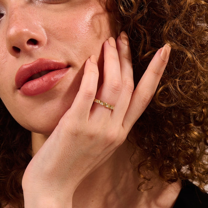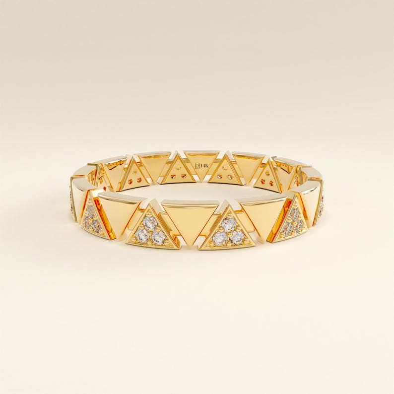 Each sparkle is ethically sourced, making this an ideal choice for women who cherish sustainability without compromising luxury. Whether worn solo as a wedding band or stacked with other favorites, this piece offers elegance, dimension, and a unique geometric rhythm that turns heads.