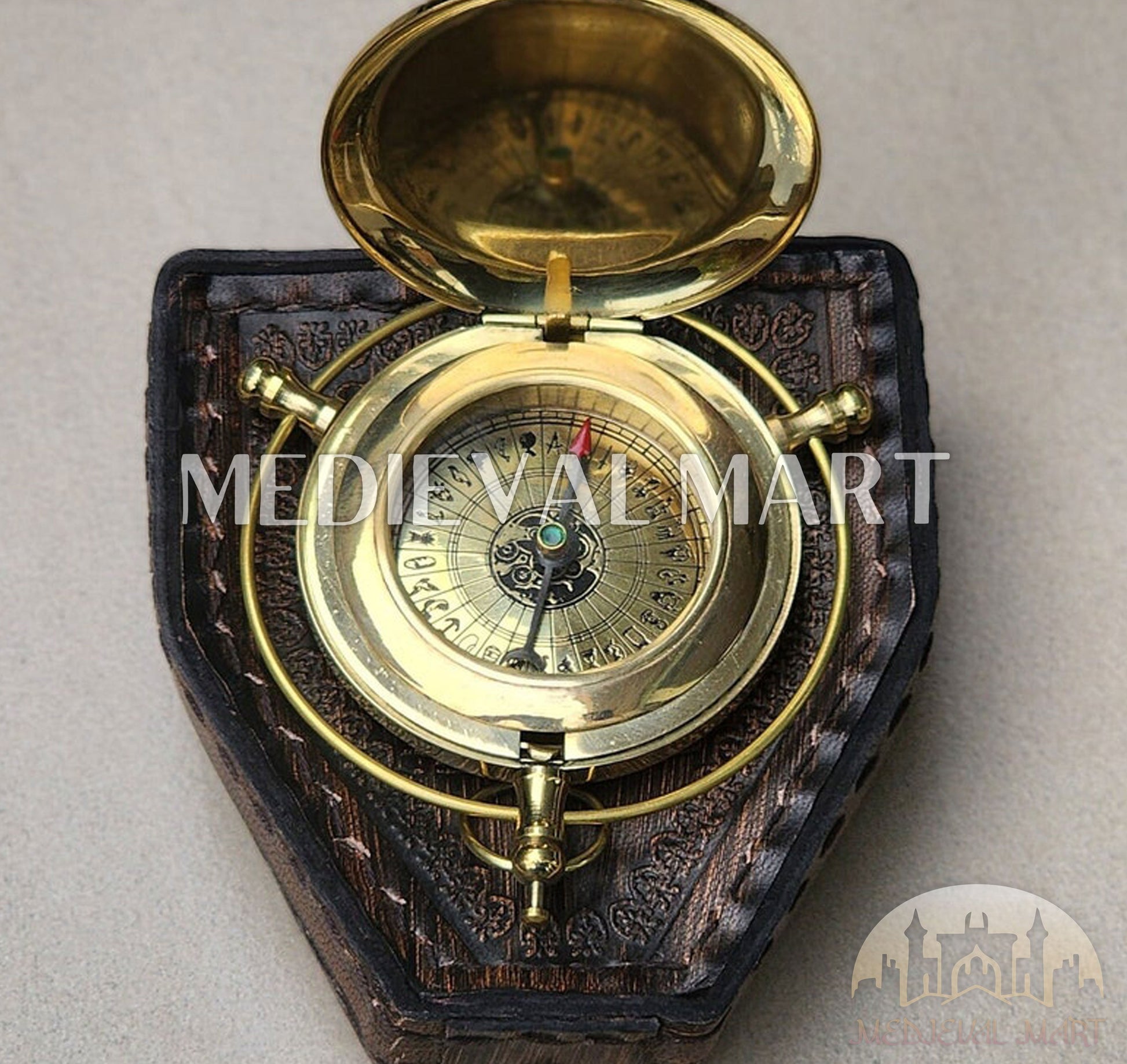 MEDIEVALMART Alethiometer Inspired Engraved Brass Pocket Compass Gold Finish W/H Leather Case | Gift For Mom, Dad