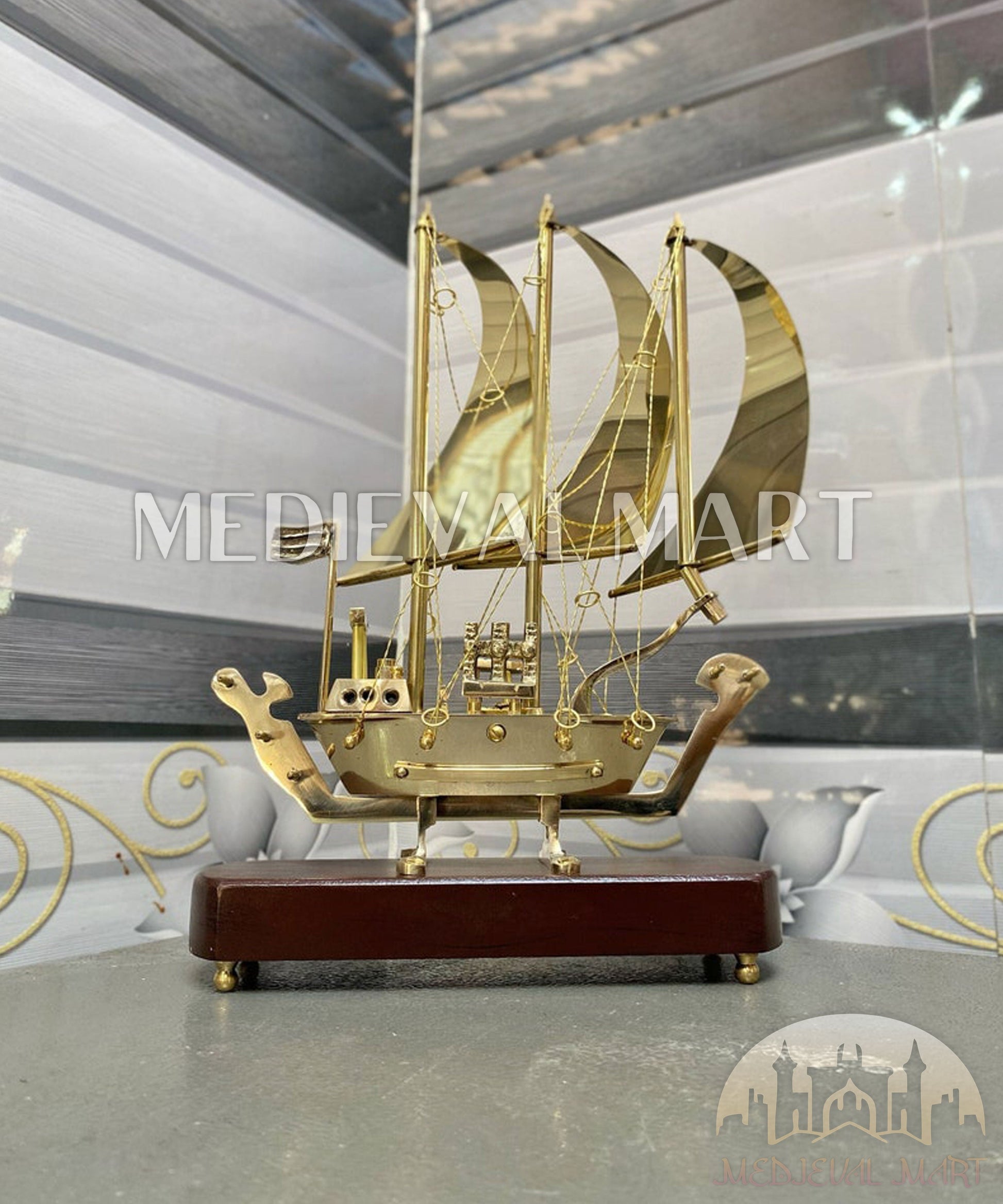 MEDIEVALMART Brass Decorative Ship W/H Wooden Base | Fully Brass Maritime Majesty Handcrafted Ship, Christmas Gifts