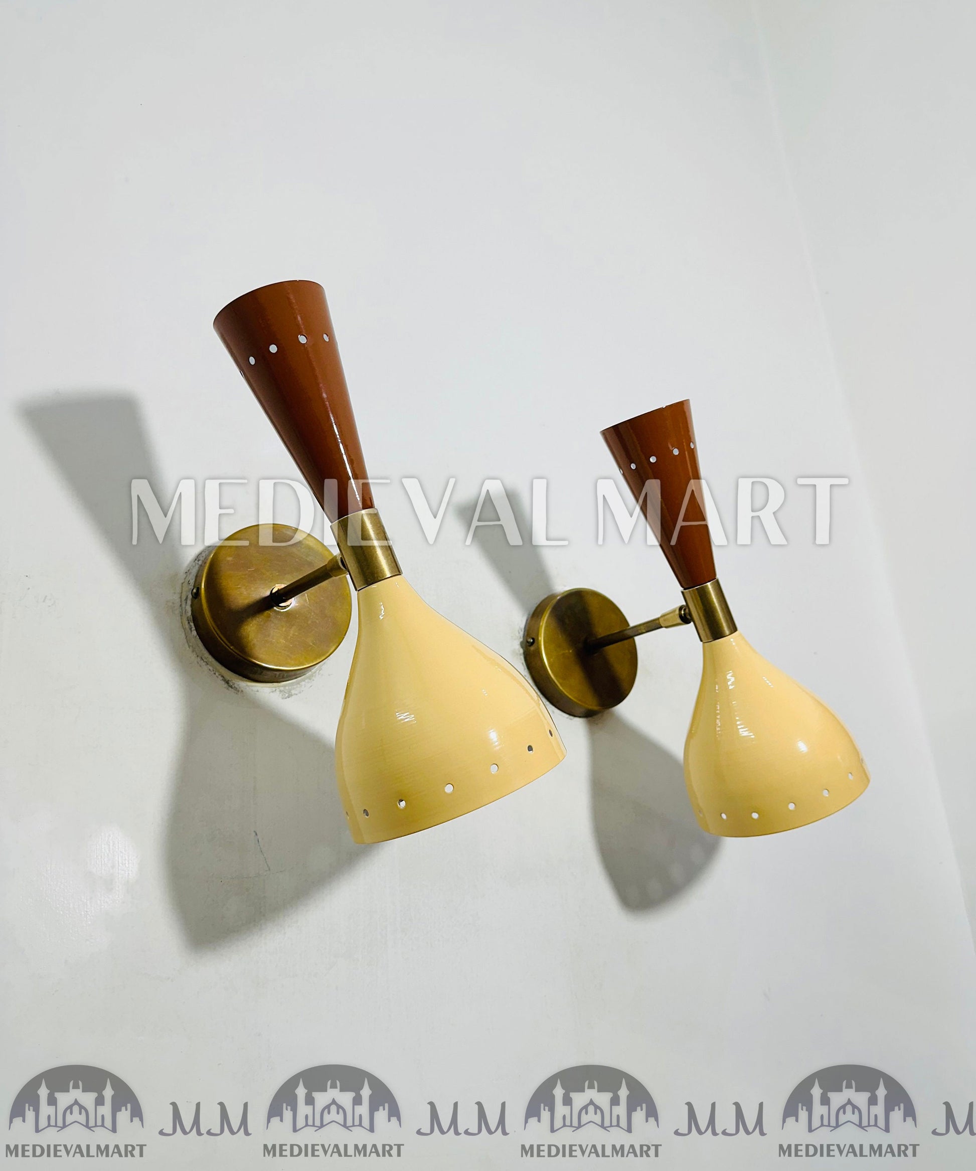 Bring elegance and function to your walls with the MedievalMart Brass Wall Sconce Pair in Beige & White, inspired by Mid-Century Italian design. This set of two adjustable wall lamps combines the timeless Diabolo silhouette with the warmth of handcrafted brass.