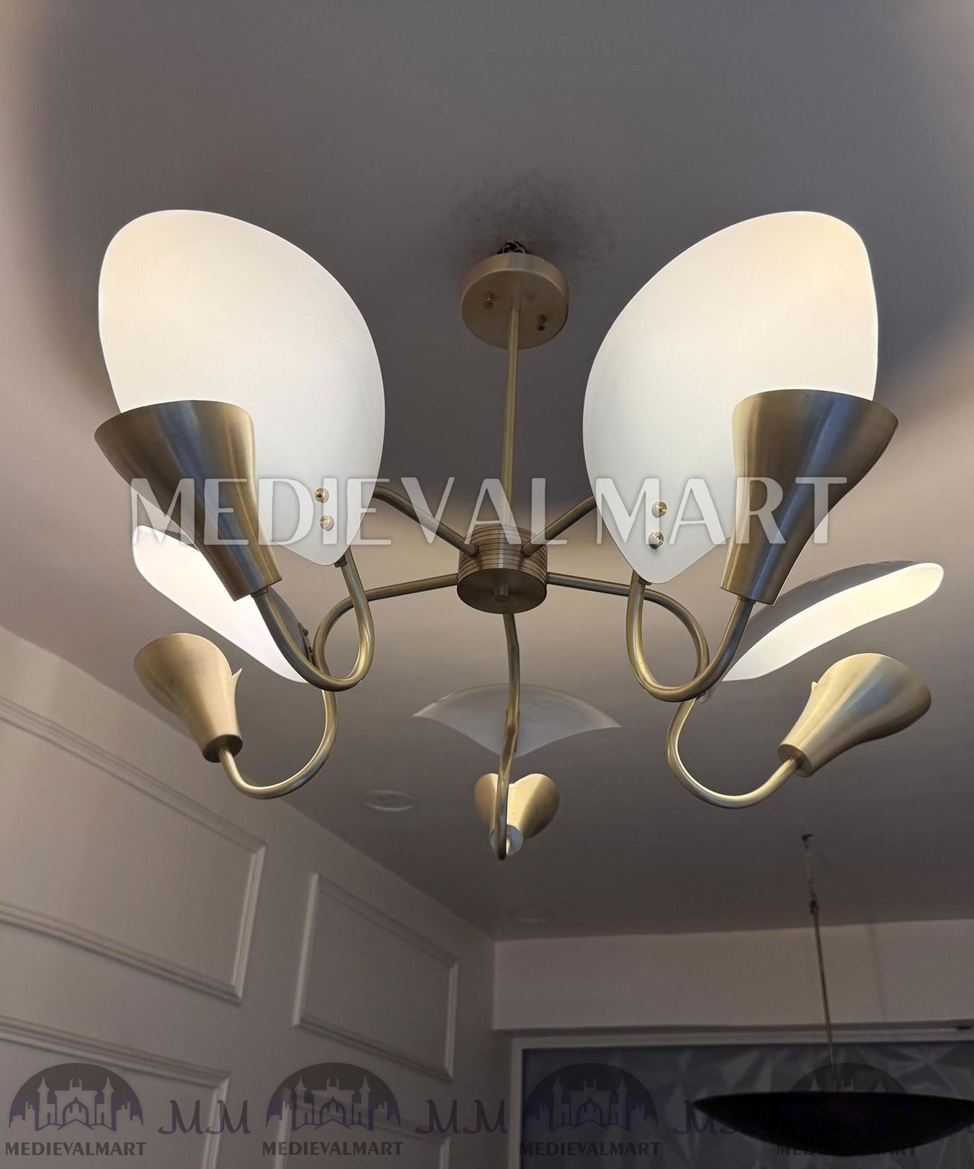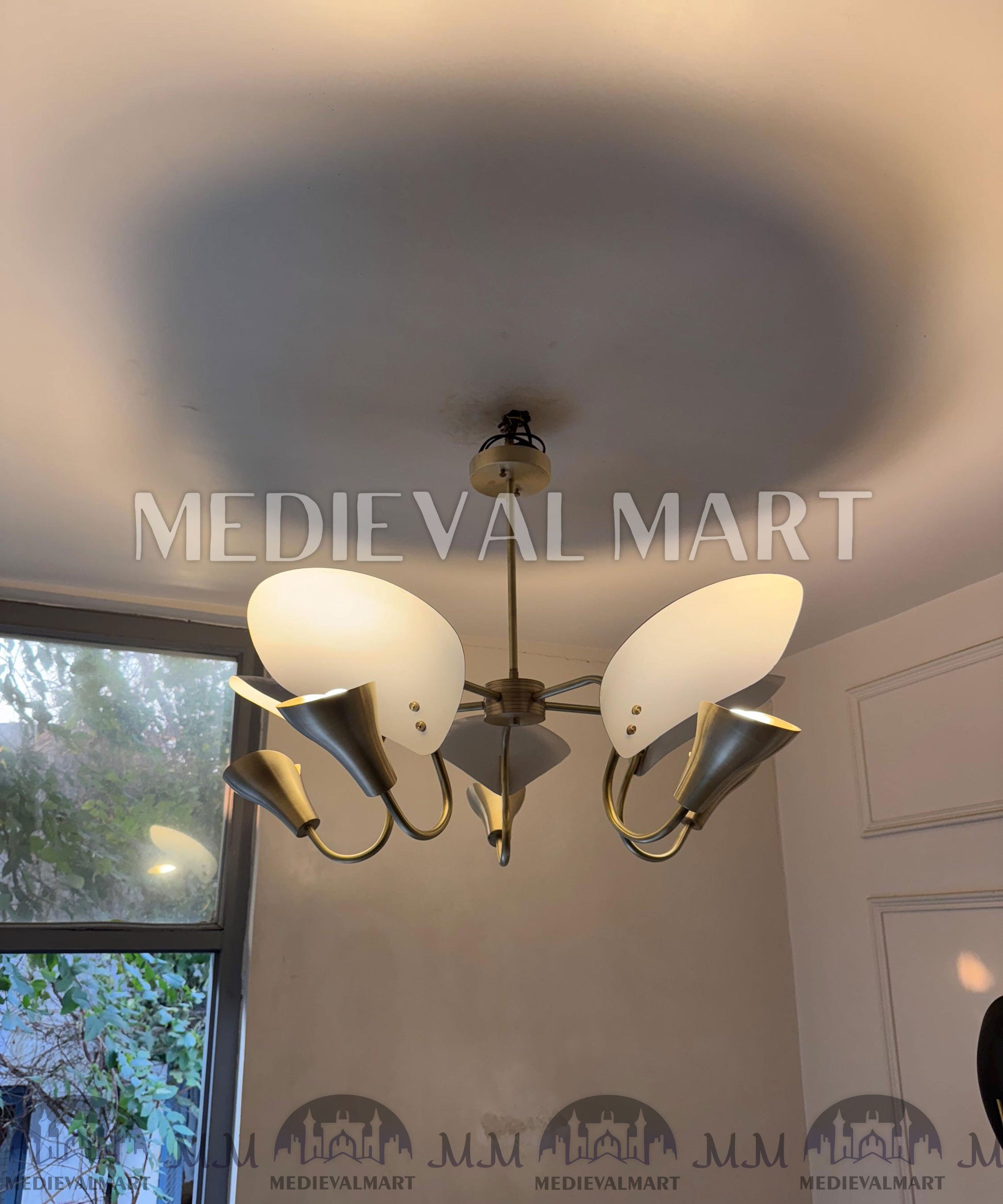 Bring timeless elegance into your home with the MEDIEVALMART Handmade Brass 5-Arm Chandelier, a stunning mid-century modern light fixture inspired by the sophistication of Italian Stilnovo design. Expertly crafted by skilled artisans from solid brass, this chandelier combines clean geometry, subtle curves, and a radiant golden hue to create a true design statement.