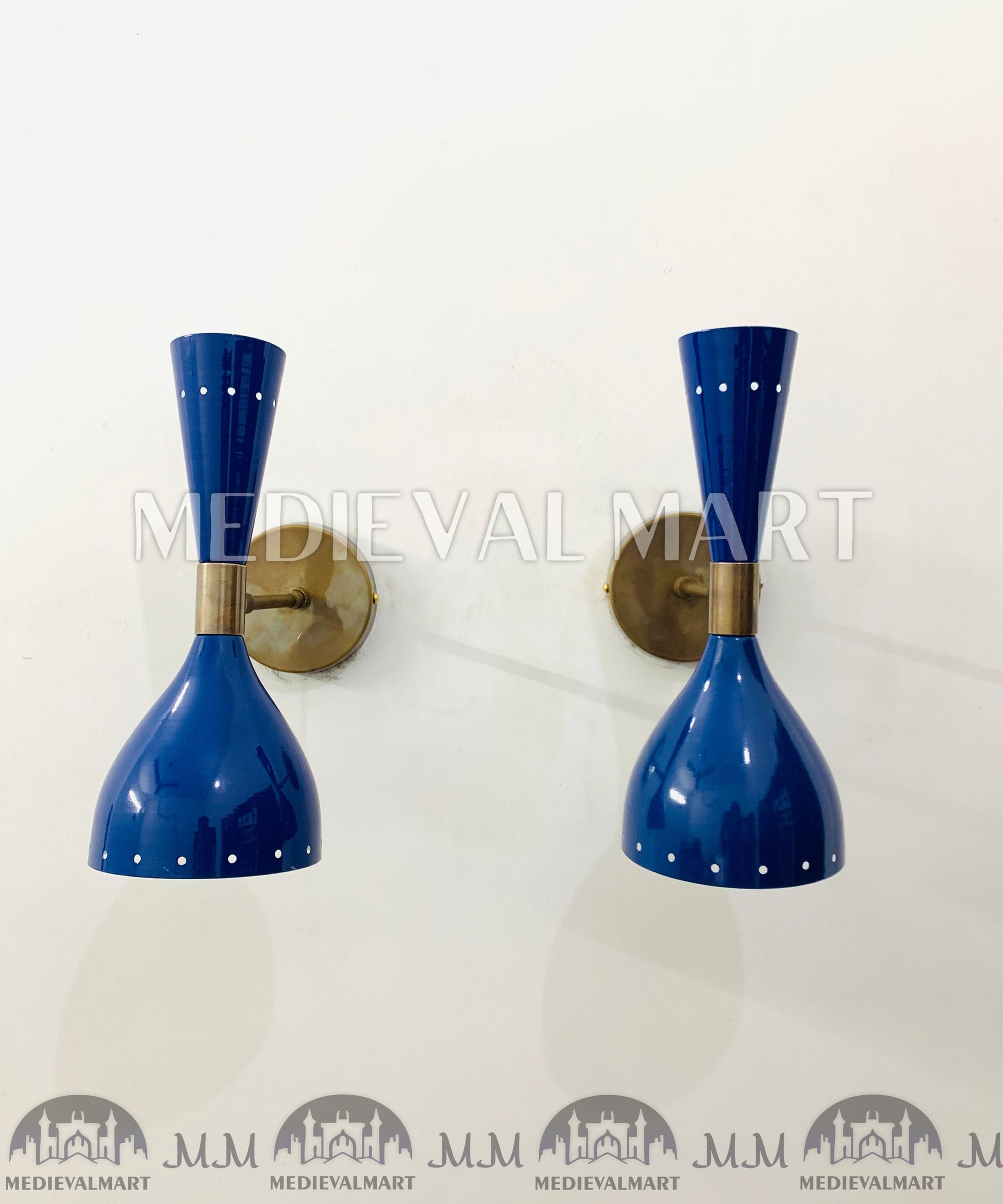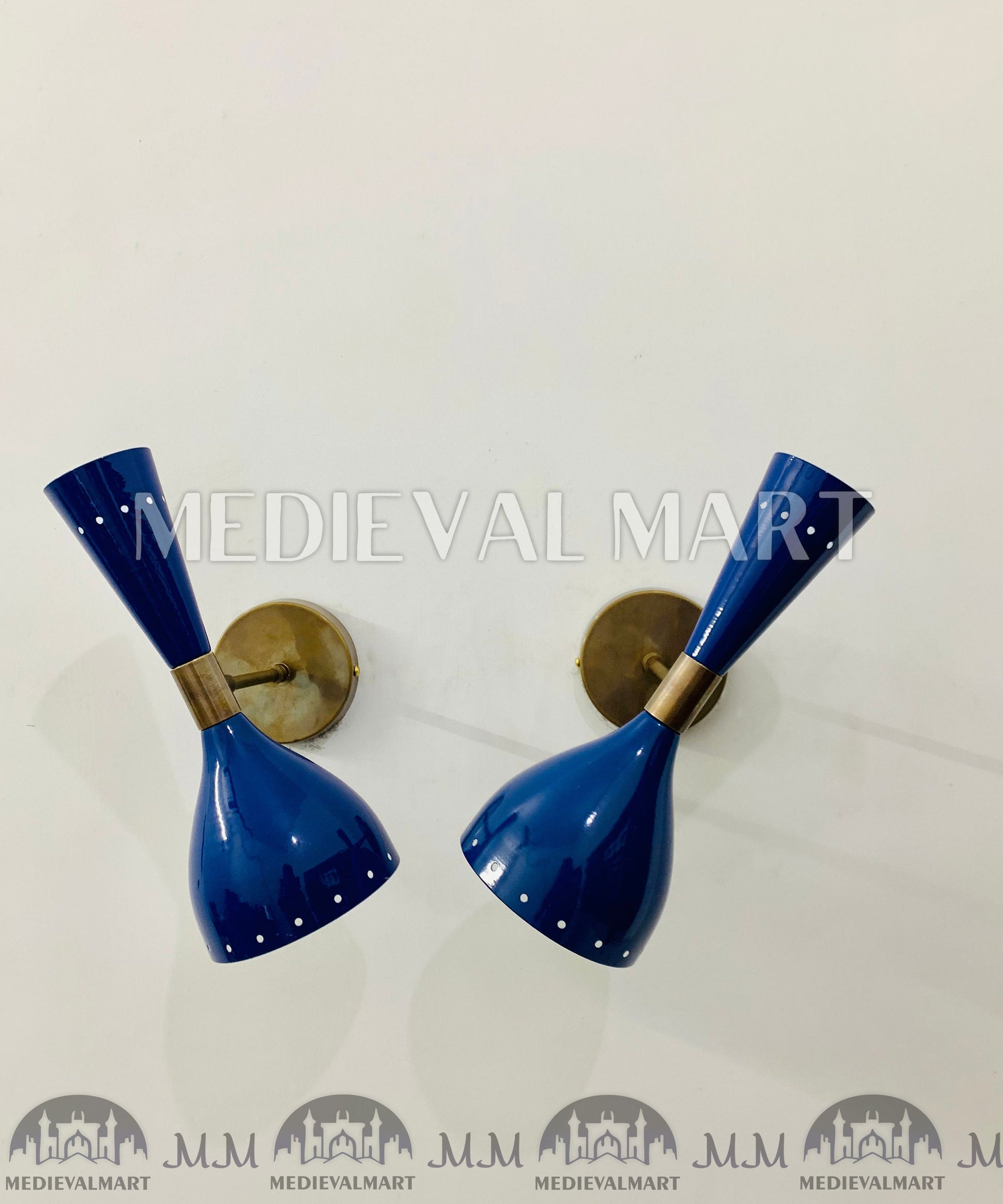 Add a touch of retro sophistication to your interiors with the MEDIEVALMART Italian Brass Wall Sconce, a stunning Mid-Century Modern light fixture finished in a vibrant shiny blue enamel.