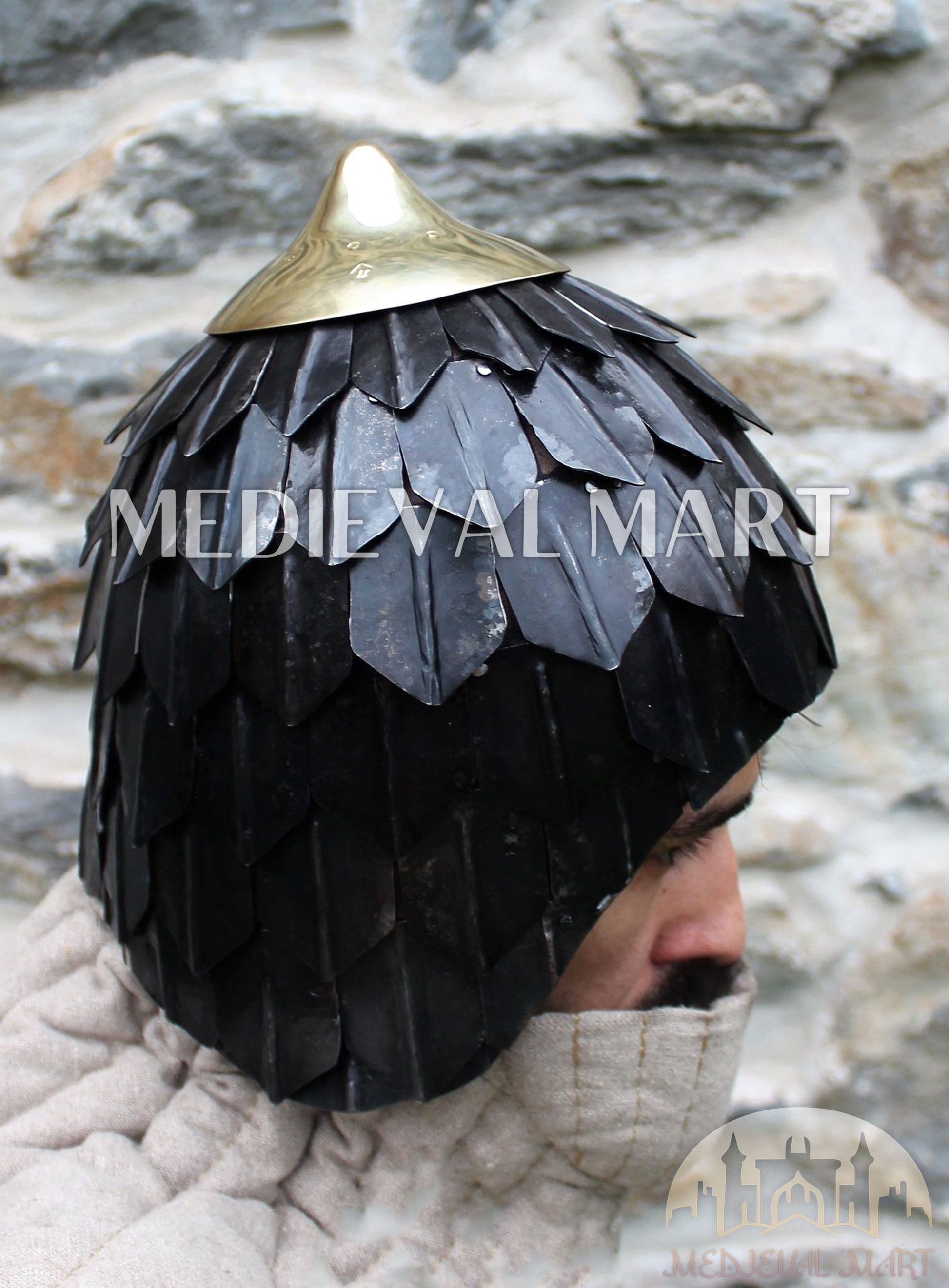 Hand-forged with precision and finished in a rich antique black polish, the helmet reflects both rugged authenticity and historic charm. The overlapping scale plates around the crown provide enhanced durability and shock resistance, making this helmet a reliable piece for reenactors, collectors, and LARP warriors alike.