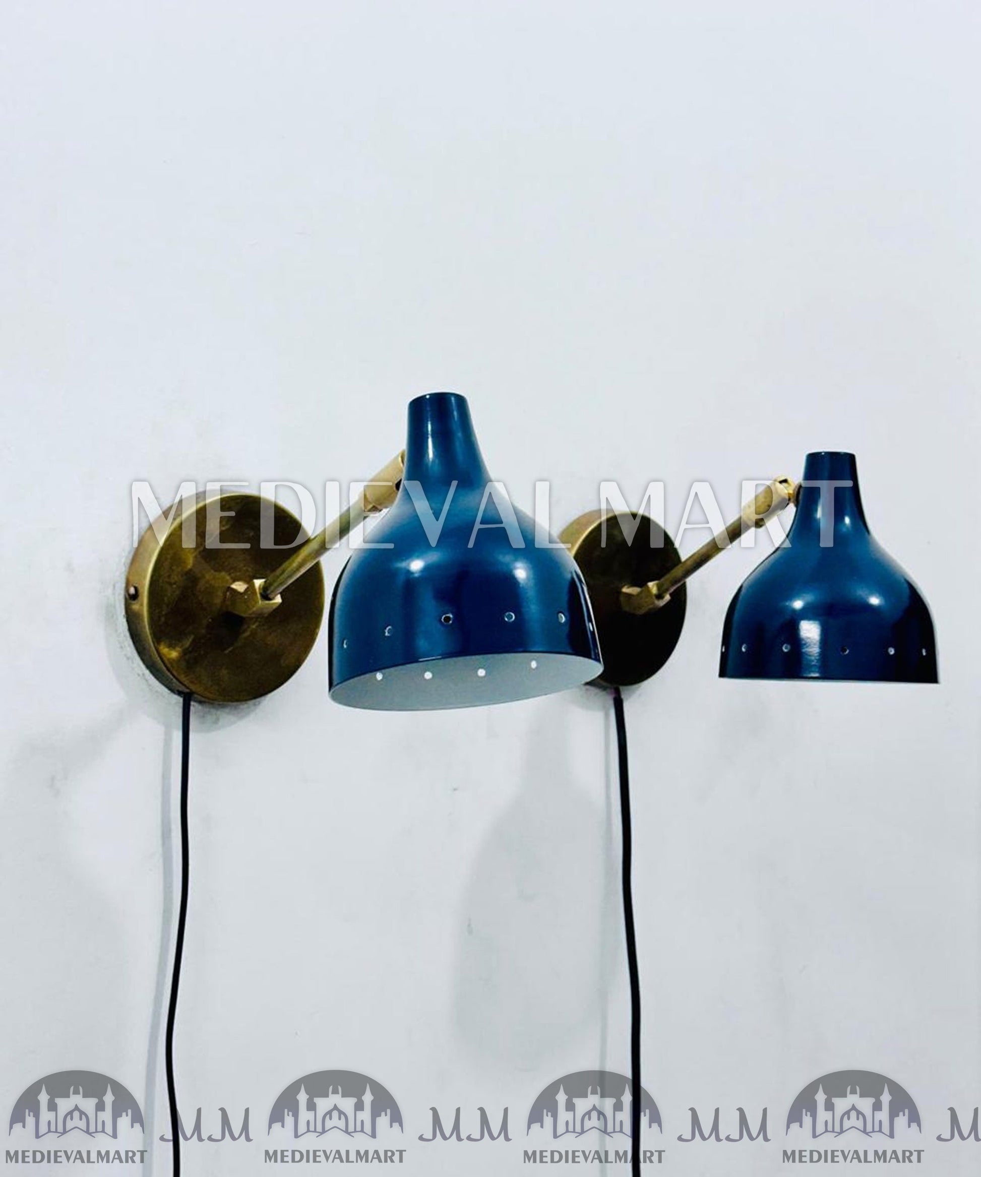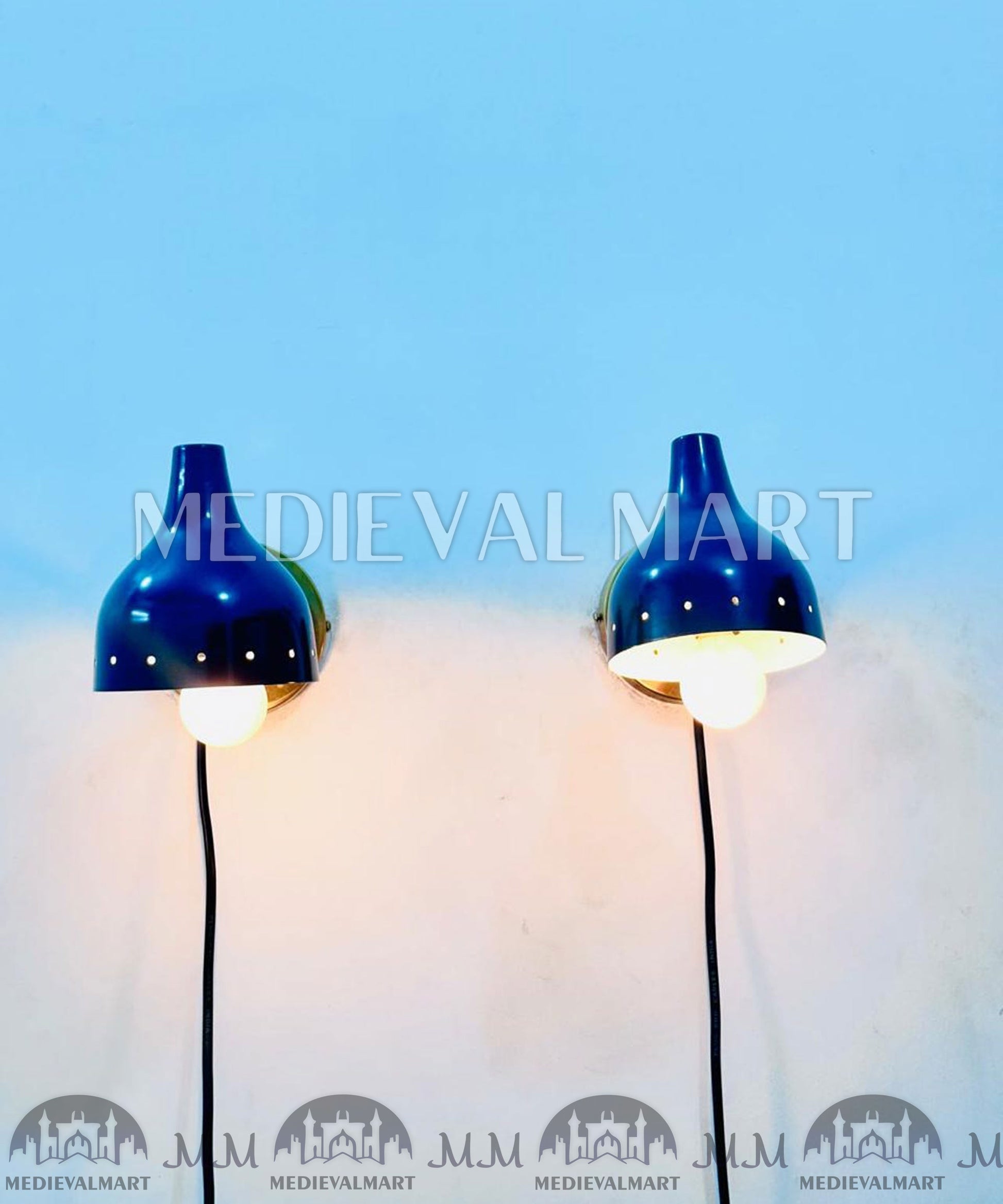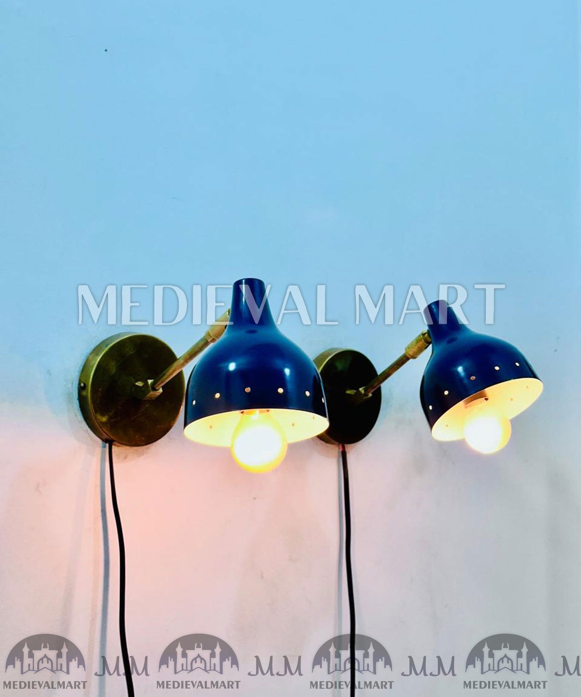 Add bold mid-century charm to your interiors with the MedievalMart Mid Century Brass Diabolo Wall Sconce Pair in Navy Blue. Inspired by classic Italian Diabolo design, this handmade set of two sconces combines elegance, color, and functionality.