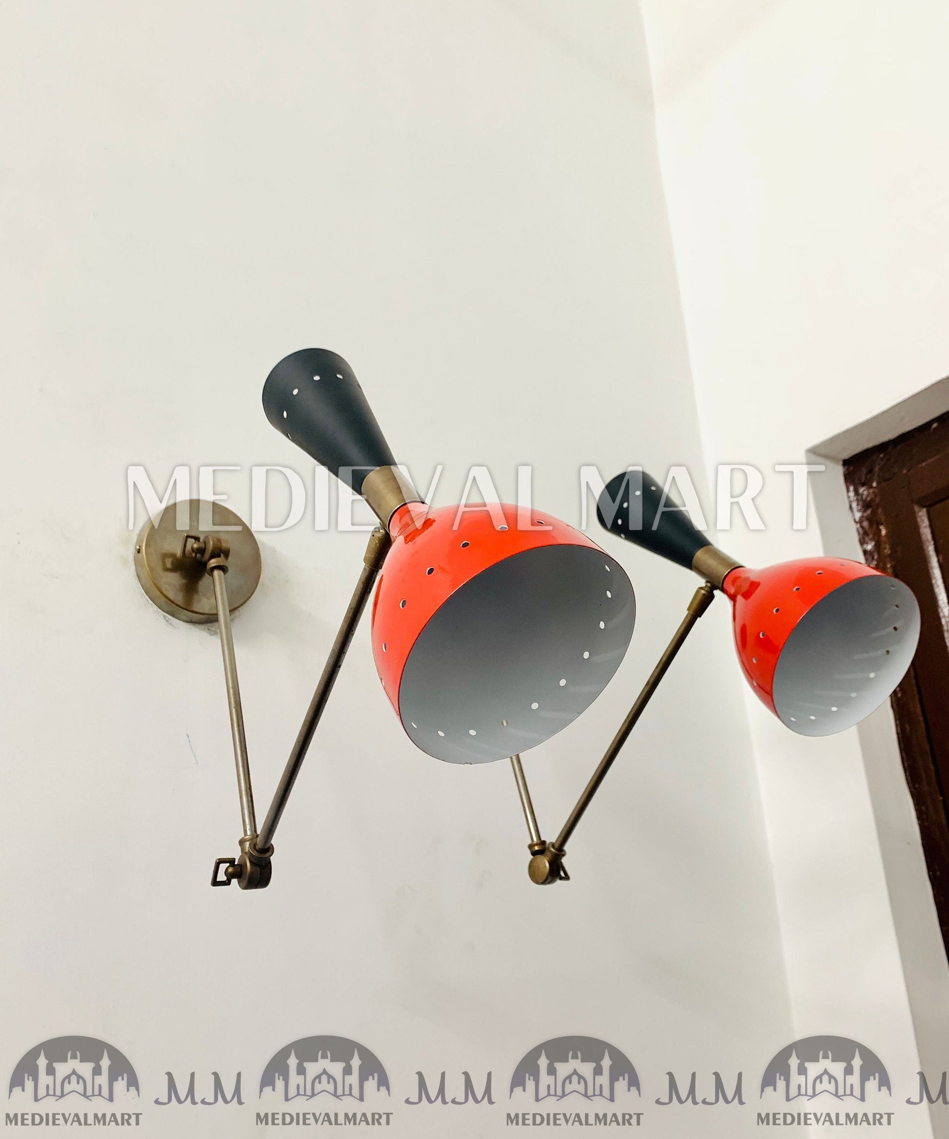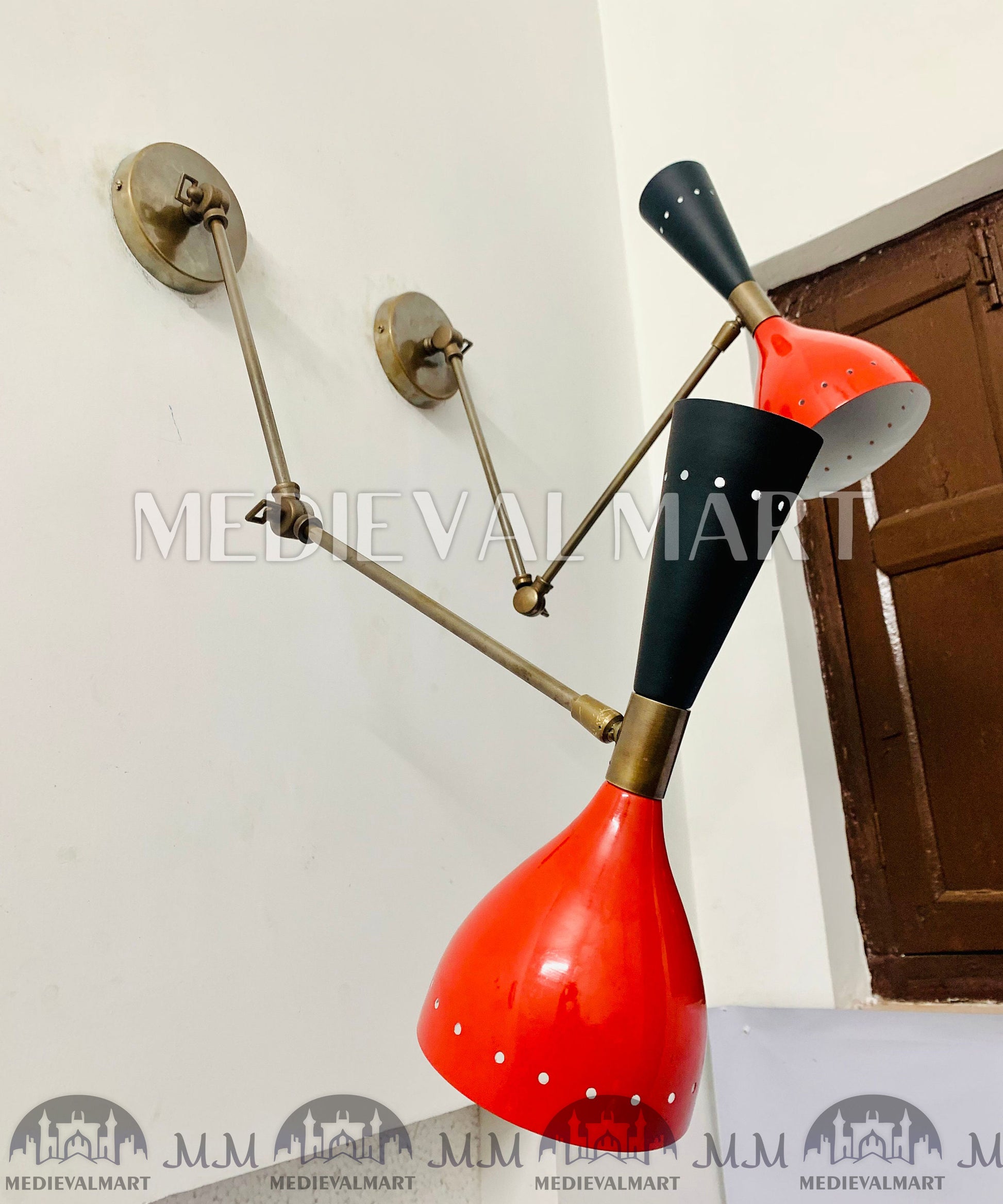 MEDIEVALMART Mid Century Italian Brass Wall Sconce Pair: Red & Black Stilnovo Light