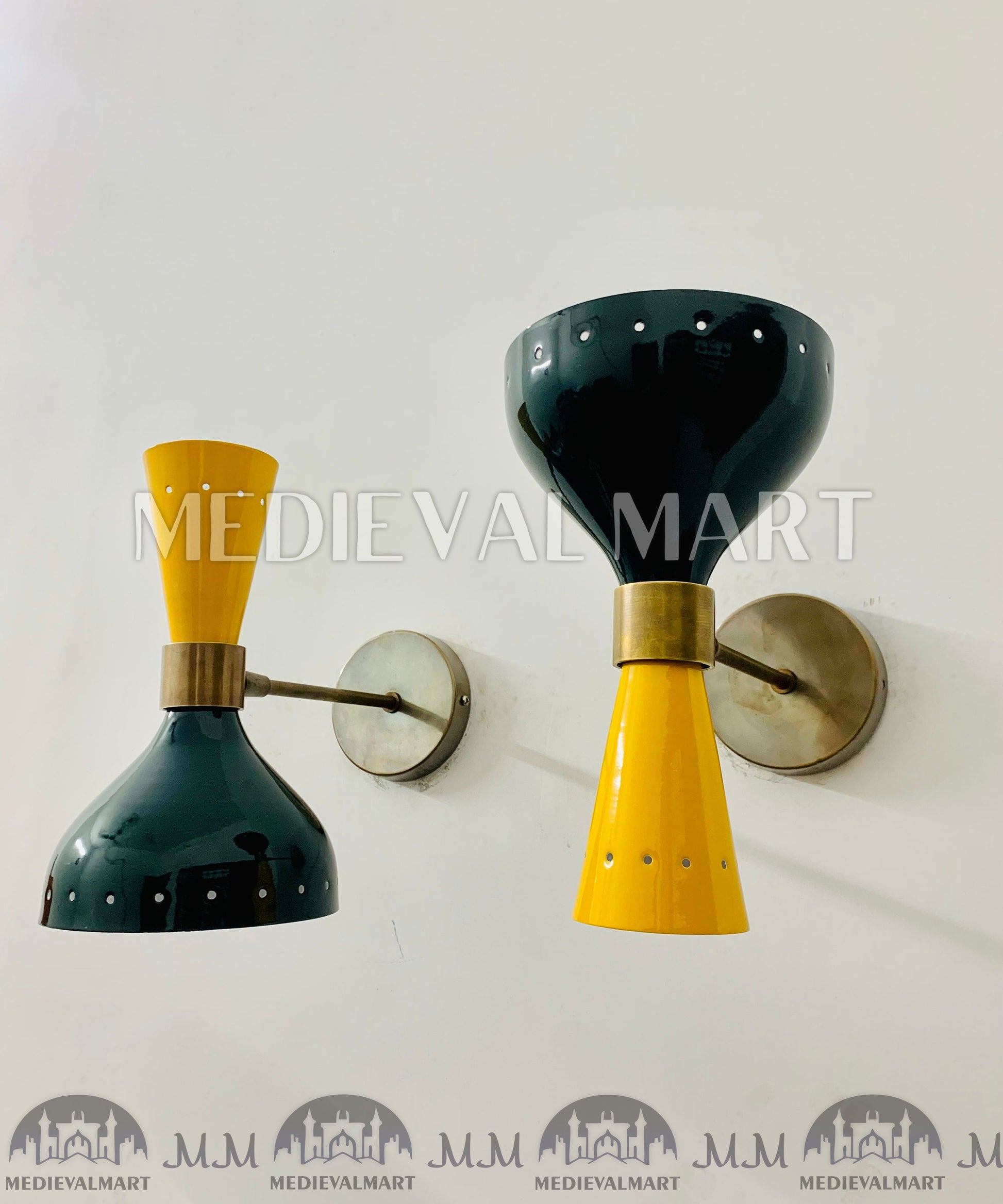 MEDIEVALMART Mid Century Italian Diabolo Wall Sconce Pair: Green & Yellow Brass Lighting