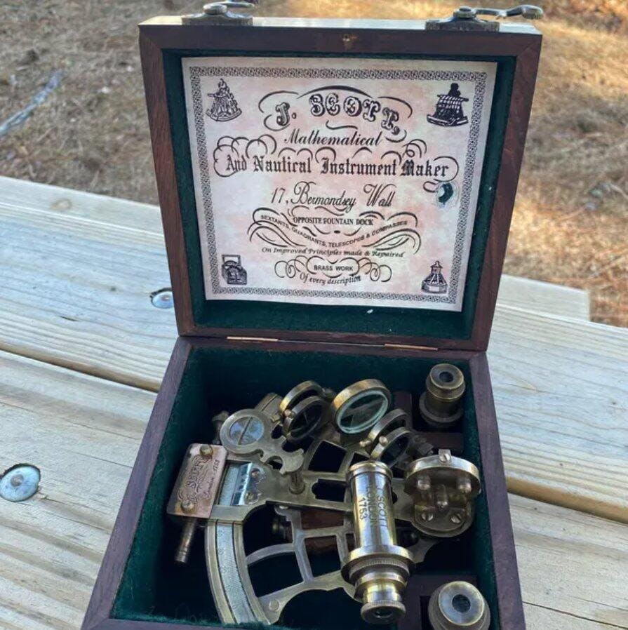 🎁This absolutely beautiful and functional brass sextant with a antique Brass finish. This Brass Sextant is made from premium quality Brass. This sextant is best In The world to give you precise result that helps you measure the Horizon, Longitude and Latitude. FRAME :- The frame is the main structure of the sextant, usually made of metal such as brass. It consists of a sturdy, curved frame with a graduated scale. INDEX ARM :- The index arm is a movable part of the sextant attached to the frame. It can be adjusted to measure angles between celestial bodies and the horizon. TELESCOPE :- A small telescope is mounted on the sextant to help the navigator sight the celestial bodies accurately. The telescope often has adjustable magnification to enhance visibility. HORIZON MIRROR :- The horizon mirror is a half-silvered mirror mounted at a 45-degree angle to the frame. It reflects the image of the horizon into the telescope. INDEX MIRROR :- The index mirror is attached to the index arm and reflects the image of the celestial body into the telescope. SHADES :- Sextants typically have shades to protect the user's eyes from the sun's glare when taking measurements. These shades can be rotated into position as needed.